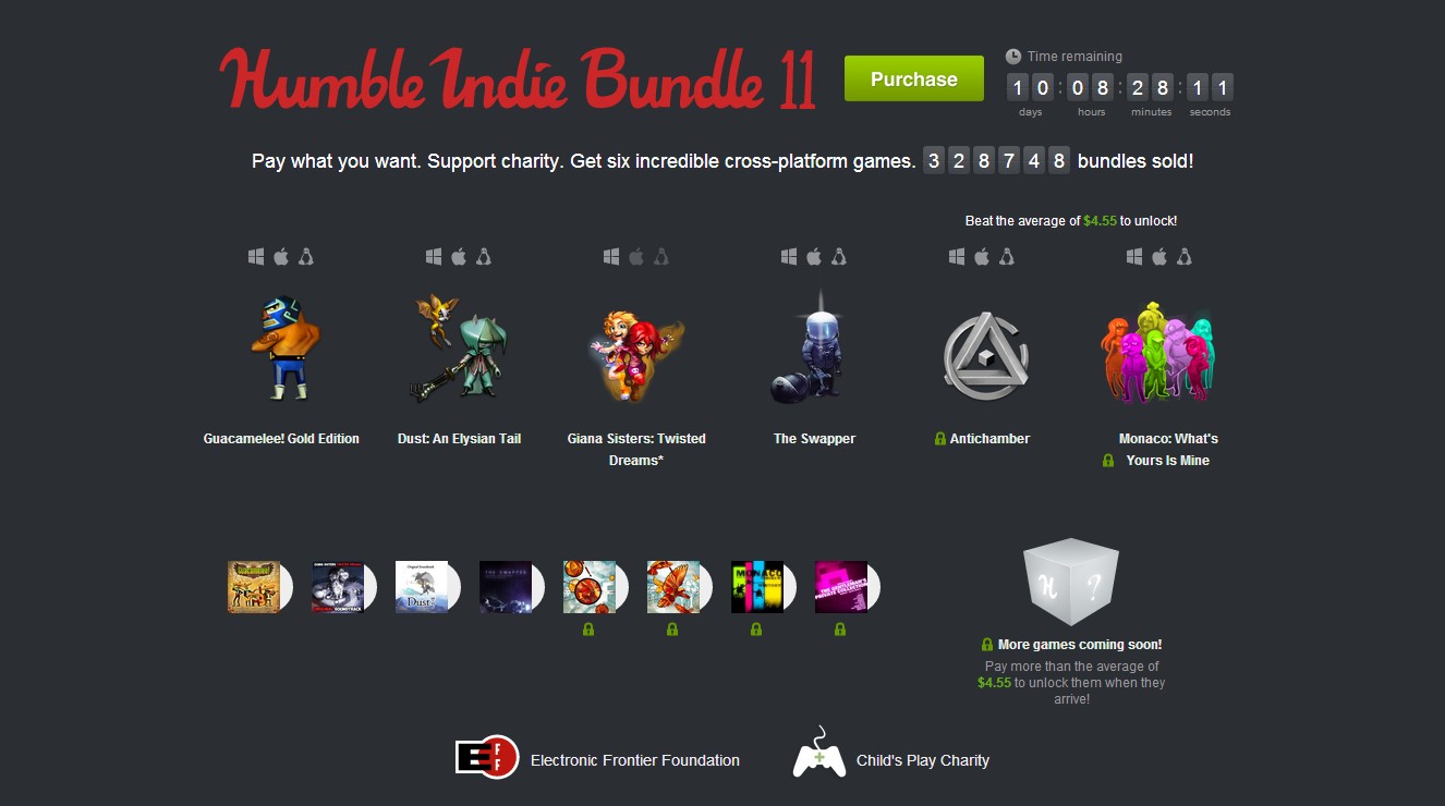Humble Indie Bundle 11 viene cargadito de grandes juegos independientes y para todos los gustos. Los juegos incluídos son Guacamele! Gold Edition, Dust: An Elysian Tale, Giana Sisters: Twisted Dreams y The Swapper. Si pagamos más de la media actual de pagos (ahora mismo 4,55 dólares), el pack también incluye Antichamber y Monaco: What's yours is mine. Se incluyen las bandas sonoras de los juegos , y versiones para Linux, Mac y PC, así como claves para Steam.