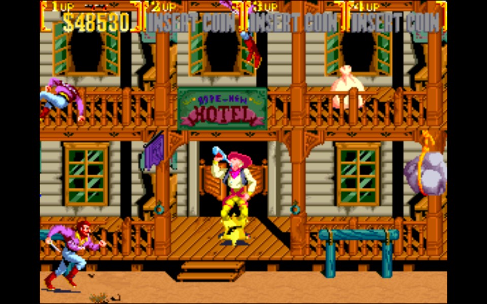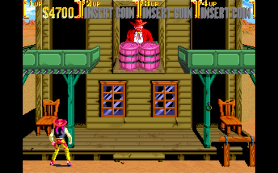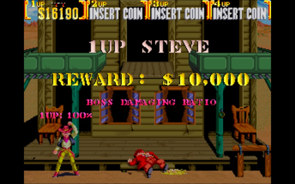 En cuanto a la versión Arcade, nos permite elegir a cuatro variopintos cazarrecompensas: Steve, Billy, Bob, y Cormano. Steve y Billy van armados con un revólver, que tienen poca dispersion pero una cadenciad e tiro alta. Bob va armado con un rifle, y Cormano (el personaje más recordado, un Mexicano con un poncho lila) una escopeta, ambas armas de cadencia de tiro baja pero con alta dispersión que acabará con varios enemigos a la vez.
