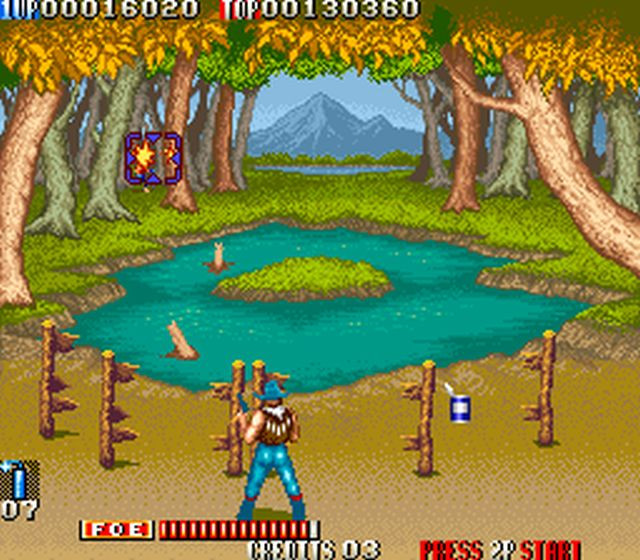 El juego nos permite jugar a uno o 2 jugadores simultanéos. En este juego cobran especial importancia los escenarios, los cuales tienen diferentes niveles de profundidad. Esto quiere decir que apareceran enemigos muy cerca de nuestro personaje (el cual está en primer plano) y otros en el horizonte que apenas veremos. Además, cada pantalla tiene multitud de elementos destruibles, y a medida que vayamos atacando veremos como van desapareciendo desde simples barriles o rocas hasta enormes casas. Para apuntar y disparar hay visible una mirilla que podemos mover libremente. Esta mirilla también sirve para mover a nuestro personaje de forma horizontal, el cual la va siguiendo por la pantalla. Tenemos dos tipos de ataque: un disparo automático ilimitado con el arma de fuego y cargas limitadas de dinamita que ocasionan gran cantidad de daño de área. Por último pero no menos importante, nuestro personaje tiene un movimiento evasivo que le permite rodar hacia un lado y esquivar los ataques enemigos. Es crítico dominar esta maniobra ya que sin ella será imposible completar las misiones, ya que nuestro personaje pierde una vida al primer impacto, y disponemos de tres vidas en cada continuación.