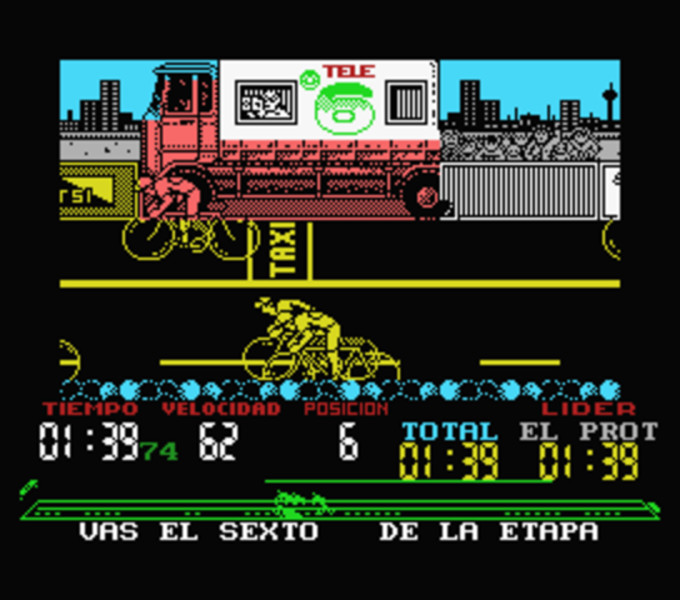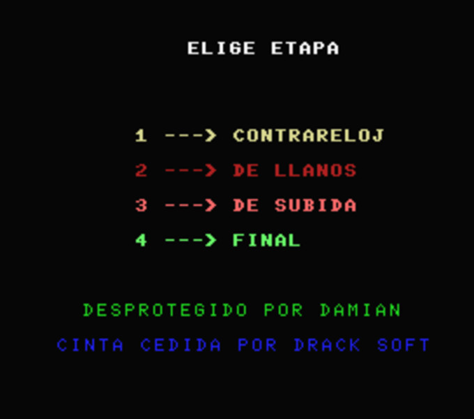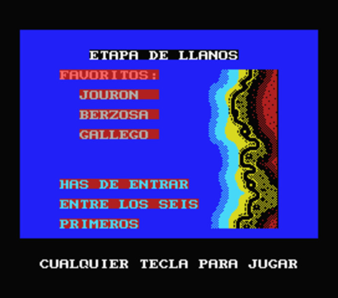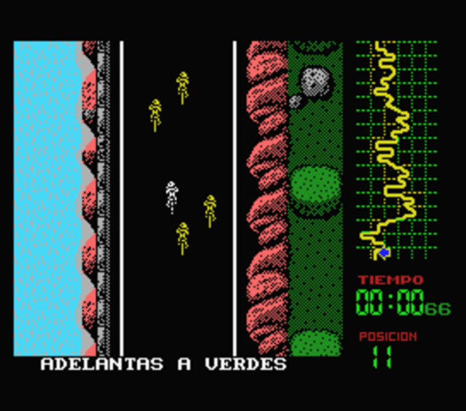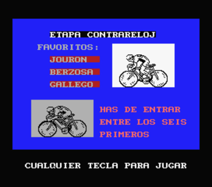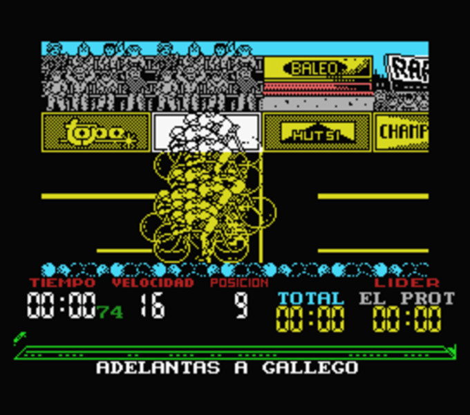 - Llano: En esta etapa deberemos avanzar (pusando la tecla hacia arriba) y tomar las curvas con izquierda-derecha. Una vez hayamos acelerado, la velocidad es constante, por lo que para adelantar lo que deberemos hacer es la mejor trazada en las curvas, teniendo cuidado de no tocar el borde, ya que entonces la bicicleta se parará y tendremos que volver a acelerar con la consiguiente pérdida de tiempo. Chocar contra otros ciclistas nos ralentizará, aunque perdiendo menos tiempo.