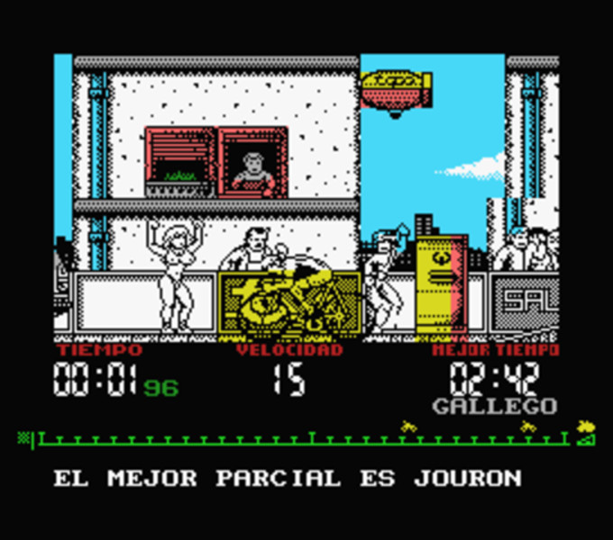- Contrarreloj: Este tipo de etapa es un machacateclas al más puro estilo Track & Field. Deberemos pulsar alternativamente izquierda-derecha lo más rápido posible para ir cogiendo velocidad. Aquí deberemos estar muy atentos a la interfaz, que nos marca la velocidad, el tiempo transcurrido, el mejor tiempo hasta el momento y un pequeño mapa donde veremos el tramo recorrido, lo que nos queda para llegar a meta y por donde van nuestros contrincantes. Además, se nos irán mostrando mensajes sobre tiempos parciales.