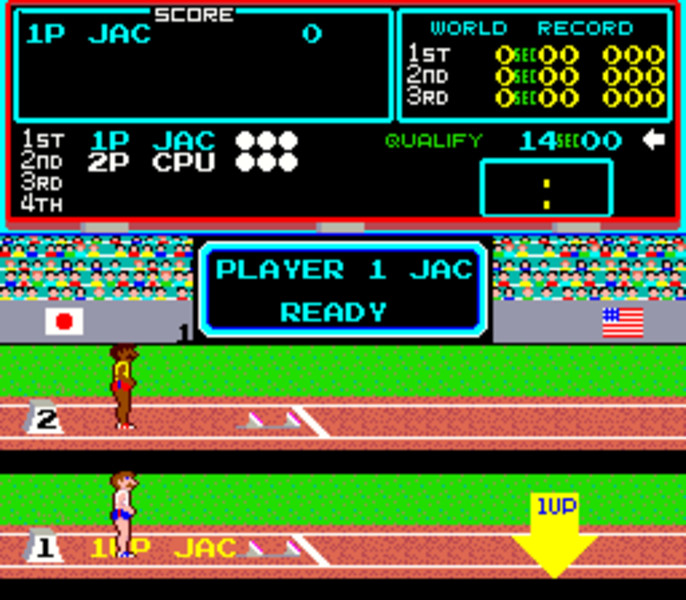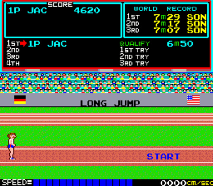 Tras elegir el nombre con el que queremos jugar (fijaos en la disposición de las letras en forma de pista de atletismo), empezaremos a participar en las pruebas. En la interfaz superior dispondremos de la información necesaria en cada prueba: número de intento, mínima marca para calificar, récords mundiales y nuestra puntuación tanto en la prueba como a nivel general (hi-score).