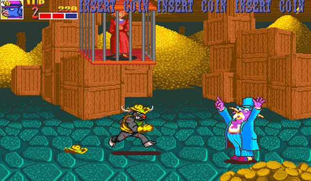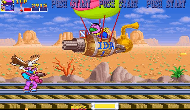 Al empezar la partida nos encontramos con juego Run and Gun en el que tenemos que disparar a todo enemigo que encontremos en la pantalla. Este juego permite jugar hasta cuatro jugadores simultáneamente. Podemos elegir entre los personajes mencionados anteriormente, cuyas diferencias entre si solo son estéticas. En cuanto a movimientos, podemos disparar nuestra arma, saltar o usar el movimiento especial. El movimiento especial básico es una embestida, pero si hemos recogido alguno de los power ups disponibles realizaremos un movimiento más poderoso. También podemos recoger un power up que mejora nuestro disparo, haciendo disparar tres balas a la vez. En pantalla podemos ver la puntuación que llevamos, la cual aumentamos derrotando a enemigos y recogiendo oro, los tres puntos de daño que soporta nuestro personaje y el número de vidas disponible.