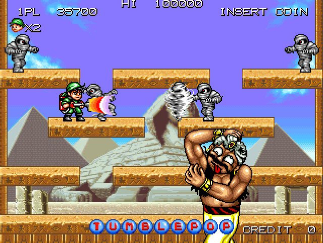 Hace ya unos años que analizamos el fenomenal y fantástico Snow Bros de Toaplan, en el que dos hermanos tienen que vencer a los enemigos lanzando bolas de nieve para enterrarlos y lanzarlos contra otros enemigos. Hoy vamos a hablar de Tumblepop, un juego que salió un año después que Snow Bros y que tiene bastante similitudes con este, pero con algunos cambios que le dan mucha personalidad.