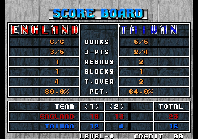 Cuando empezamos la partida, y como suele ser habitual en los juegos de basketball, lo primero que tenemos que hacer es seleccionar el equipo con el que jugaremos. Tenemos 10 equipos disponibles, cada uno con 18 puntos distribuidos entre las siguientes características: Mate, lanzamiento de 3 puntos, velocidad y defensa. Esta distribución de puntos hace que cada equipo tenga diferentes puntos fuertes y débiles. En la versión europea y en la japonesa, estos equipos están basados en países, pero en la americana en cambio están basados en ciudades de Estados Unidos.