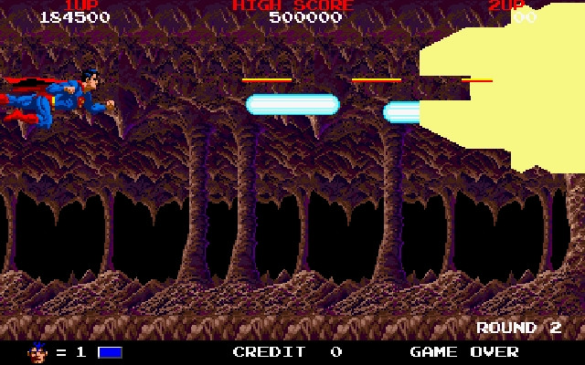 En cuanto a los enemigos, encontramos de diferentes tipos y dificultades. El primero al que nos enfrentaremos es el típico esbirro fácil de eliminar, pero cuando vienen en grupos pueden suponer un problema. A medida que avanzamos salen a nuestro paso enemigos más difíciles y poderosos. Algunos tendrán habilidades especiales como hacerse invisible, lanzar proyectiles o agarrarnos. Al final de cada parte hay que enfrentarse a un jefe que pondrá a prueba nuestra habilidad. La lástima es que tanto en el caso de los esbirros como de los jefes se podría haber aprovechado la licencia de Superman mucho más, ya que solo nos enfrentamos a enemigos con un diseño bastante simple y genérico, y aunque alguno nos recordará a algún villano de los cómics, tampoco se hace referencia a ellos en la historia. De hecho, algunos de los jefes se repiten en varias fases con patrones de colores diferentes, lo cual enturbia la calidad del título. Tengo que decir que entre los enemigos hay uno que sorprende por su vestimenta, ya que es una conejita rosa vestida solamente con botas y guantes azules y cuyo ataque es saltar hacia nosotros de una forma bastante cómica, quizás en Taito había algún diseñador con gustos peculiares...