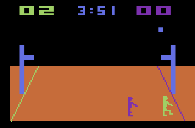 A nivel gráfico también es un juego muy sencillo, como se puede esperar de uno de los primeros títulos para esta consola. De todas formas, todo se reconoce sin problemas, y las animaciones de los jugadores son bastante simpáticas. El sonido es muy básico, solo escuchamos el bote del balón y el sonido del marcador al encestar una canasta.
