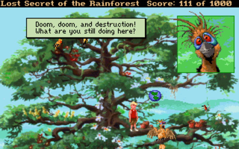 Como era muy habitual en las aventuras de Sierra, el juego incorporaba un marcador de puntos que se iba actualizando a medida que íbamos realizando acciones correctas. Para finalizar la aventura no era necesario llegar, en este caso, a los 1000 puntos totales. Era una forma de intentar alargar la rejugabilidad, si no llegabas al máximo podías intentar rejugarlo para conseguirlo. En el caso de Lost Secret of the Rainforest, muchos de estos puntos no obligatorios obedecen a las acciones de reciclaje o limpieza que podemos hacer con Adam.