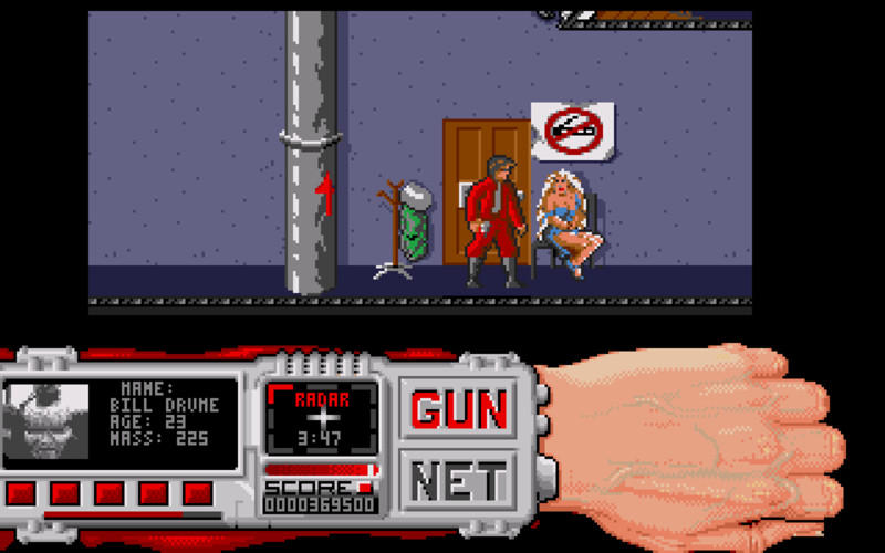 La segunda parte consiste en capturar al criminal en cuestión, convirtiéndose en un plataformas de scroll lateral. En la interfaz inferior recibiremos las órdenes concretas, que deberemos respetar en medida de lo posible. Por ejemplo, habrá veces que nos dirán capturar al criminal vivo o muerto, pero otras veces nos exigirán que esté vivo o que lo mandemos a criar malvas. Para ello, contamos con dos armas: la pistola, para abatir a todo maleante que nos salga al paso, o la red, para capturarlos vivos. Muy importante será la acción de saltar, que nos permitirá sortear obstáculos, como trampas en el suelo o peligrosos perros corriendo al galope y también enemigos.