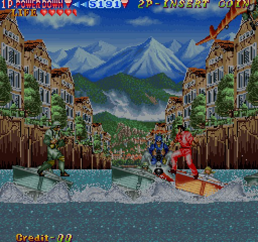 Esta aventura es puro espectáculo de principio a fin. Casi toda la partida se desarrolla mientras corremos, saltamos y luchamos sobre diferentes tipos de vehículos a toda velocidad: lanchas, coches, camiones, trenes y avionetas. Además, en varios de ellos se cambia el ángulo de la cámara, pasando de scroll horizontal a frontal, con un efecto muy parecido al que podemos ver en otros juegos como Out Run. Los enemigos no son demasiado variados, siendo en su mayoría soldados, pero sí son variadas las situaciones en las que nos atacarán, ya que los veremos conducir aviones, coches, lanchas y motocicletas para darnos caza. También nos enfrentaremos a enemigos más poderosos, como unas mujeres capaces de invocar rayos o soldados acorazados. Por supuesto, al final de cada nivel nos espera un impresionante jefazo, como un enorme robot que ocupará gran parte de la pantalla.