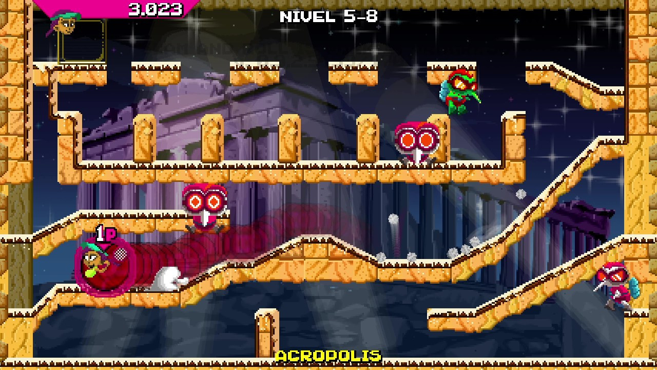 Este título no solo tiene una jugabilidad arcade, sino que han cuidado mucho todos los aspectos del juego para dar ese "feeling" de juego de los años 90. No solo a nivel audiovisual con un pixel art muy llamativo y una música muy animada, también en pequeños detalles como voces digitalizadas en los menús, algo que estuvo muy de moda en las recreativas de los 90. Otro detalle muy bonito es la introducción de cada uno de los mundos mostrando una escena graciosa, algo que recuerda a juegos como Tumblepop o Joe & Mac Returns.
