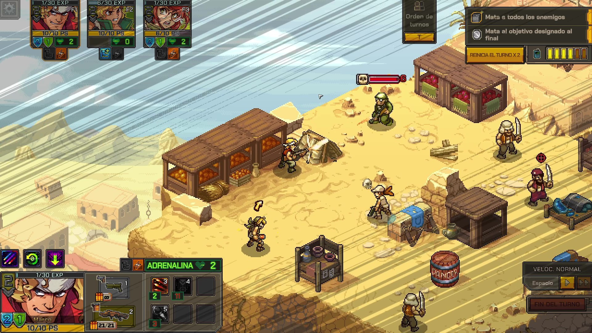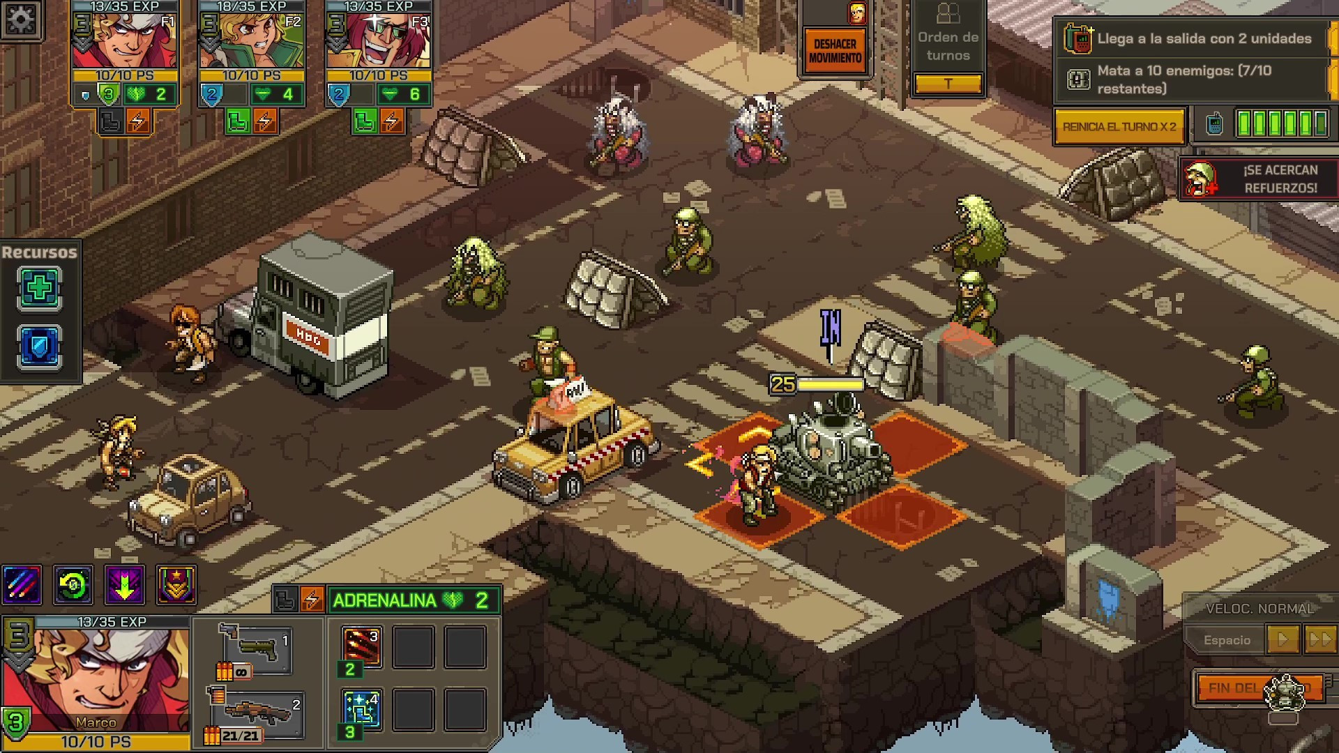 Las batallas siguen las pautas establecidas por el género, pero tiene características añadidas que le dan un toque distintivo. En cada turno podemos mover a nuestros personajes en su rango de alcance y realizar una acción, ya sea atacar con una de las armas o usar una habilidad. Para superar los escenarios tenemos que buscar posicionarnos para ganar ventaja sobre los enemigos. Esto lo podemos conseguir de diferentes métodos, como buscar cobertura, estar en un terreno elevado o incluso interactuar con objetos como grúas o barriles para dañar a los enemigos. Pero no basta con quedarse quieto en un sitio, el juego premia que nos movamos por el escenario. Este es un gran detalle que me encanta, ya que es un guiño a los orígenes arcade de esta saga en la que hay que moverse y disparar sin parar. Al mover los personajes estos generan puntos de esquivar y puntos de adrenalina. Los puntos de esquivar reducen el daño recibido, que junto a los puntos de cobertura pueden anular completamente el daño enemigo. Los puntos de adrenalina se usan para ejecutar las habilidades, las cuales son fundamentales para salir victoriosos.