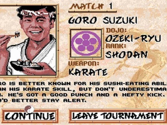 Una vez estemos preparados para ir al gran torneo, nos dirigiremos al estadio. El torneo consiste en 12 combates de dificultad ascendente, con enemigos que utilizarán armas de las que nosotros no disponemos. Como máximo podremos utilizar cuatro veces una de nuestras artes marciales (karate, bo, kendo y nunchaku), por lo que deberemos escoger sabiamente cual utilizar dependiendo el enemigo que tengamos enfrente.
