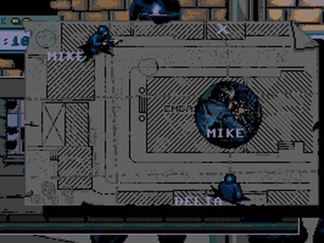 En nuestra primera intervención, deberemos escoger cual de nuestros tres primeros miembros del escuadrón (DELTA, ECHO y MIKE), deberá comenzar la misión. La primera pantalla es de scroll lateral, y nuestro policía deberá esquivar las luces que enfocan hacia la calle donde se encuentra, para evitar recibir una ráfaga de disparos, Para ello, podremos agacharnos, dar volteretas por el suelo, o escondernos en una ventana o puerta. Una buena idea es ir consultando el mapa para saber donde nos encontramos.