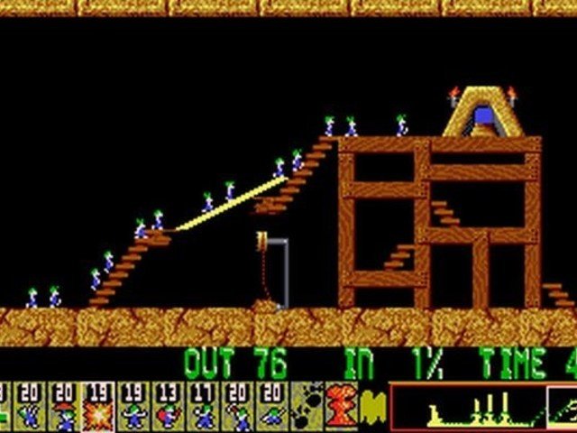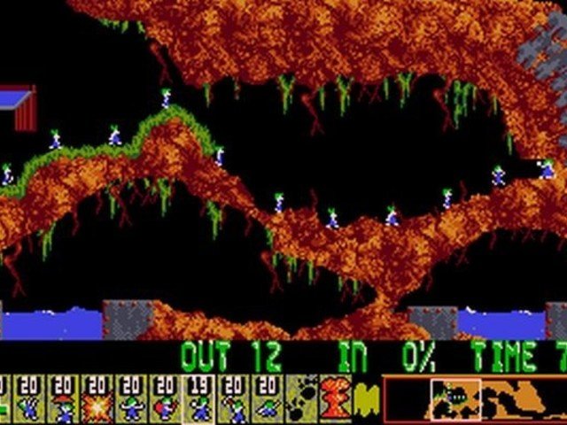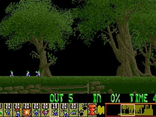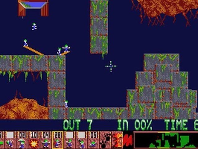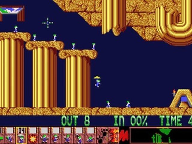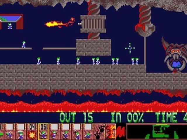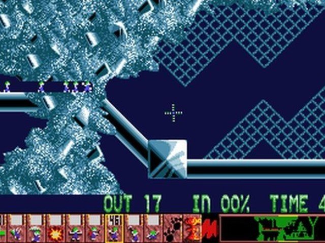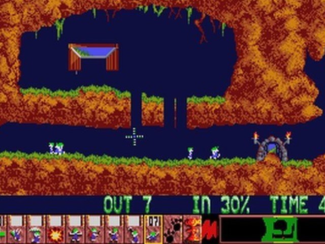 Todas estas opciones se encuentran en la interfaz inferior donde además podremos acelerar o frenar el ritmo de salida de nuestros lemmings apretando los botones de + y -, un botón de pausa y un botón de autodestrucción que hará explotar a todos nuestros lemmings, útil si sabemos que ya no cumpliremos los objetivos de la pantalla porque han muerto más lemmings de la cuenta. Por último podremos ver la silueta del mapa.