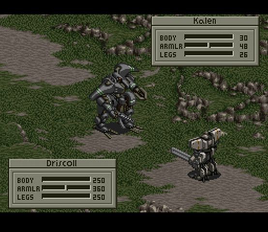 Una vez explicada esta primera fase, pasemos a la fase de batalla. Como hemos comentado anteriormente, es un tablero dividido en cuadrados y se desarrolla por turnos. Cada mecha tiene su vida repartida entre las partes de su estructura y, la pérdida de una de ellas, tiene diferentes consecuencias. Perder un brazo (y el hombro, ya que se pierde conjuntamente) supone la pérdida de la capacidad de utilizar las armas que en ese brazo tuviéramos y, en el caso de perder ambos brazos, el mecha se quedará sin poder atacar. Si nos destruyen las piernas perderemos la capacidad de movimiento, pudiendo movernos solo a celdas adyacentes. El más crítico es que destruyan el cuerpo, ya que en ese caso, el mecha explotará y dispondremos de un efectivo menos en combate. Hay ciertos ítems que nos permitirán en nuestro turno reparar alguna de las partes antes de que sean completamente destruidas. Recordaréis que dijimos que a veces nos interesaría un solo impacto fuerte, o más impactos pero de menor intensidad. Imaginaos que tenéis a un adversario que tiene alguna parte de su cuerpo muy debilitada, quizá nos interese mejor realizar más impactos de menor intensidad para ver si podemos destruir definitivamente esa parte del mecha y, así, tener una ventaja táctica. Al utilizar un arma, cada impacto golpeará al mecha enemigo en un lugar aleatorio, no lo podremos elegir.
